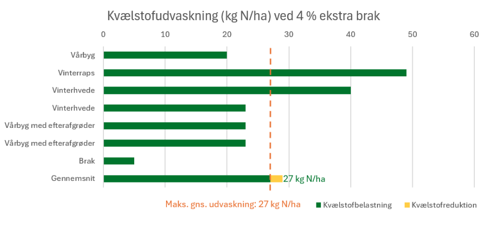 Vi nærmer os det teoretiske måltal om i gennemsnit maksimalt at udvaske 27 kg kvælstof pr. ha, men er ikke helt i mål endnu. I dette regneeksempel er det altså nødvendigt at braklægge et større areal. Braklægges 4 % ekstra, får vi nedbragt udvaskningen, så vi lige akkurat overholder måltallet: