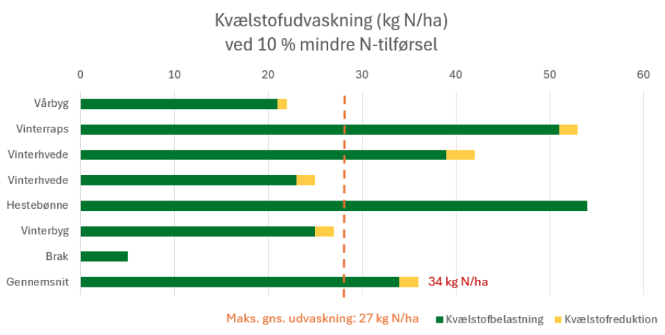 Hvis det ikke er tilstrækkeligt, kan udvaskningen af kvælstof selvsagt mindskes yderligere, hvis tilførslen af kvælstof mindskes. Reduceres tilførslen af kvælstof med 10 %, ser udvaskningsniveauerne således ud: