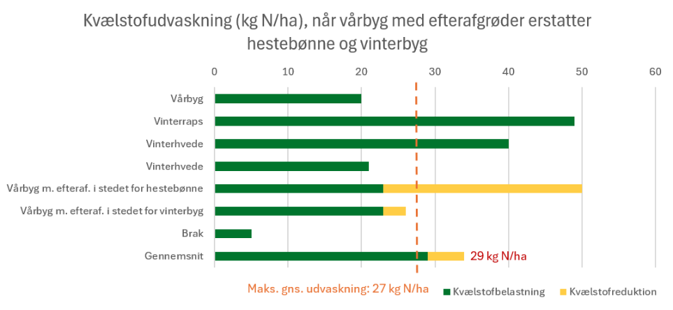 For at begrænse udvaskningen yderligere, kan det blive nødvendigt at tænke i alternative afgrøder for at kunne holde sig inden for udledningskvoten. I dette eksempel udskiftes hestebønner og vinterbyg med vårbyg med efterafgrøder: