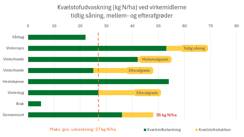 Sætter man ind med virkemidlerne tidlig såning, mellem- og efterafgrøder, kan udvaskningen af kvælstof reduceres således: