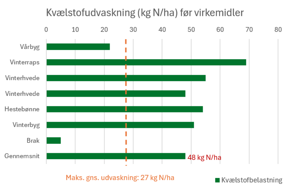 Du kan ikke overføre tallene direkte til din egen bedrift. Se i stedet regneeksemplet som en illustration af, hvor stor kvælstofbelastningen er fra de enkelte afgrøder i forhold til hinanden, og hvad der skal til for at nedbringe den. Tallene giver en klar indikation af, hvordan afgrødevalg også vil blive et virkemiddel for at nedbringe kvælstofudvaskningen.