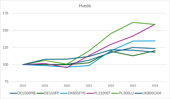 Kigger vi på udviklingen siden 2016 (index 100) er omkostninger for alle ejendomme i de fire lande steget. I grafen er udvalgt seks ejendomme. Den engelske bedrift har oplevet den laveste stigning og er i 2024 på index 118. De to tyske bedrifter – en lille og en stor – ligger på hhv. index 120 og 124. Den danske ejendom er steget til index 135, mens de polske ejendomme – også en lille og en stor – begge er steget til index 160, og dermed er dem, der har oplevet den største stigning.